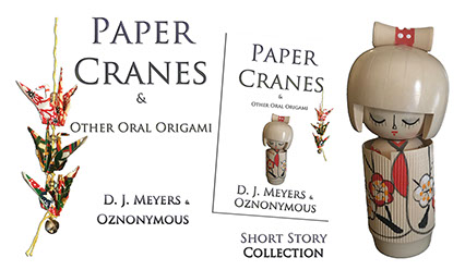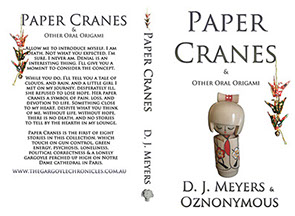 Now available on Amazon - click here - Paper Cranes & Other Oral Origami contains 8 works. From shorts to novella, the tales explore social issues from disarmament, marriage equality, the environment, psychosis, loneliness, the explosion of political correctness, and gun control.
